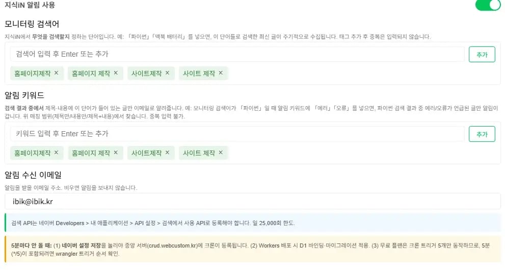 지식iN 검색 알림 기능 추가 및 크론 동작 방식 개선